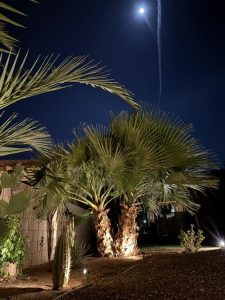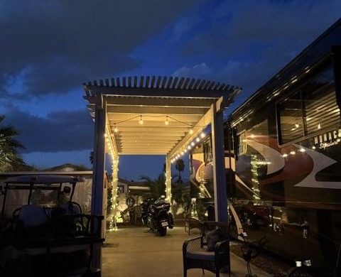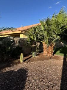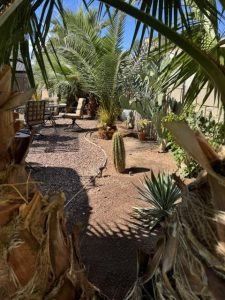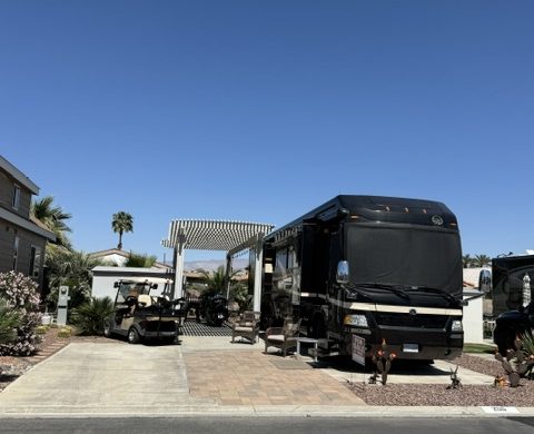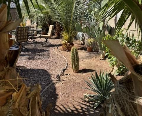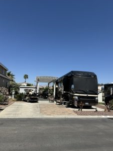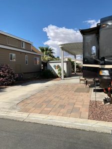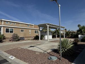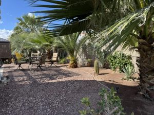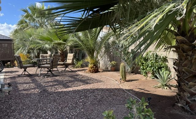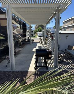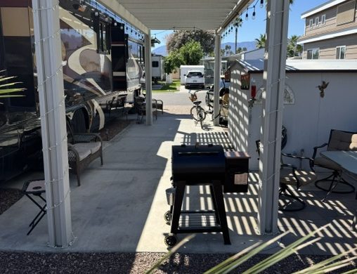 This 36×65 RV lot is on the north wall. New desert landscaping and irrigation with outdoor lighting. Older 8×10 shed with full sized fridge. Patio table with 4 chairs, wicker loveseat with two chairs and coffee table plus stand-up patio heater. A new power pedestal was just replaced in April 2025.