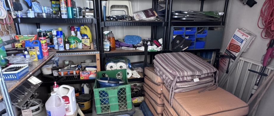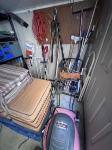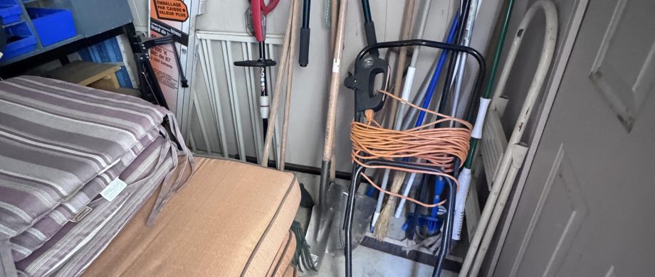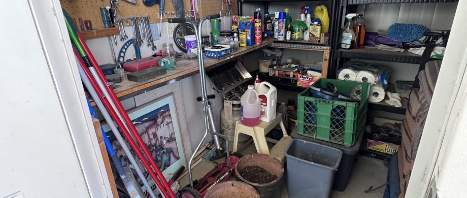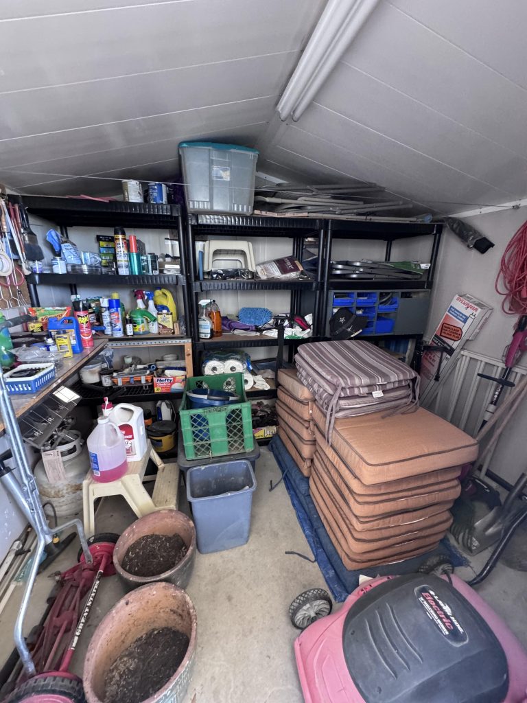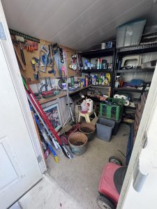 The large storage shed is full of tools, gardening equipment, lawn mowers and storage racks. All of these items are also included in the sale.