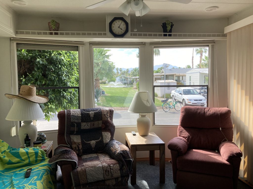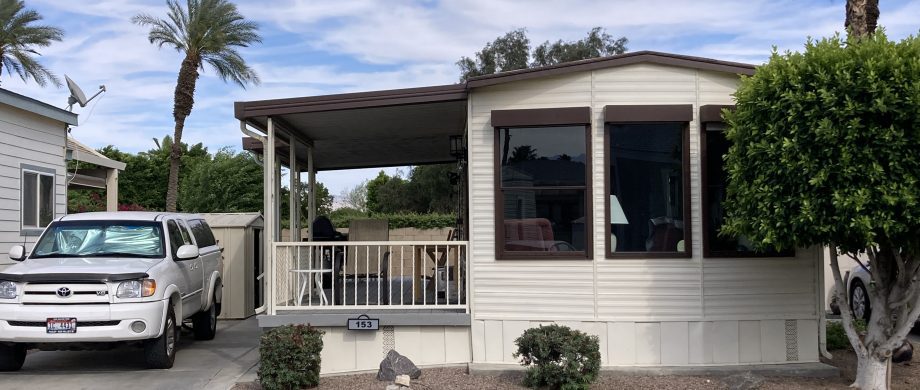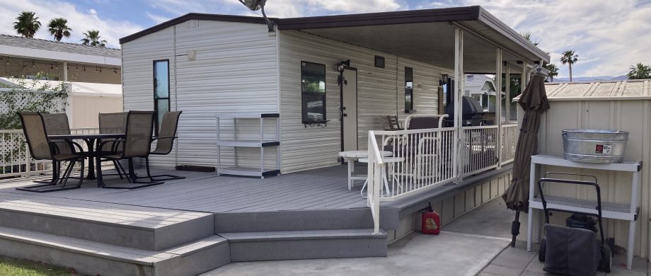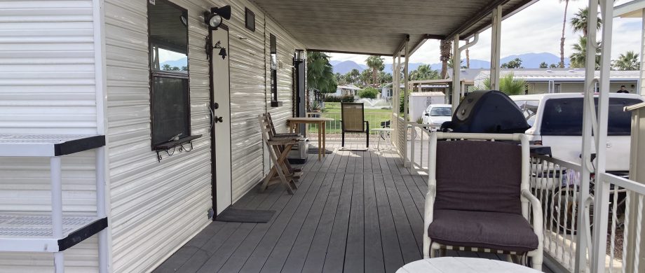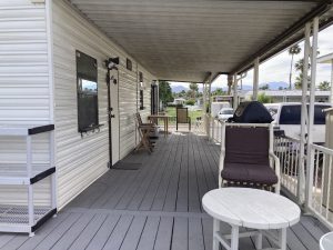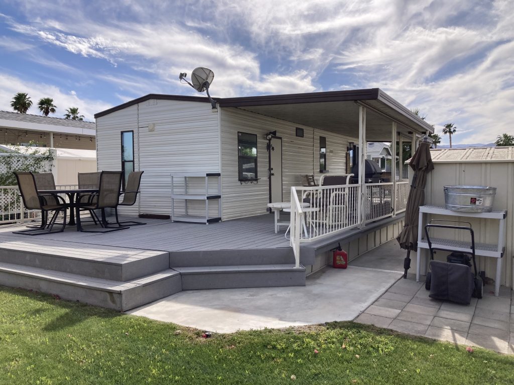 This park model has a beautiful view out of the front livingroom of the mountains, sunsets and a fountain. It is situated on the east wall on the ‘A’ side of the park. There is a surround Trex Deck that has great mountain views. The bathroom has just been renovated now in 2026 with a beautiful walk-in shower, granite counter top and new sink and toilet. A new hot water heater was installed too. Some of the window coverings inside are new this year. The refrigerator is new and was just purchased is 2026. This park model is very conveniently close to the clubhouse and many amenities. Outside has the roll down window shutters. All the things/tools in the shed included.