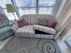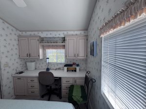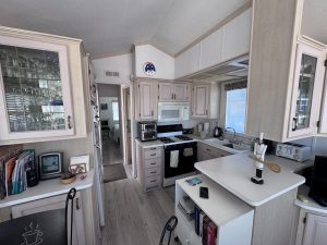 The interior of the park model is light and airy with high ceilings and lots of windows to let the light inside. All the cabinets throughout the park model have a light finish and adds to the openness this park model provides. The living room is open and offers plenty of seating.