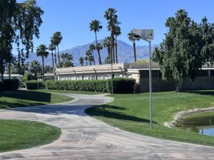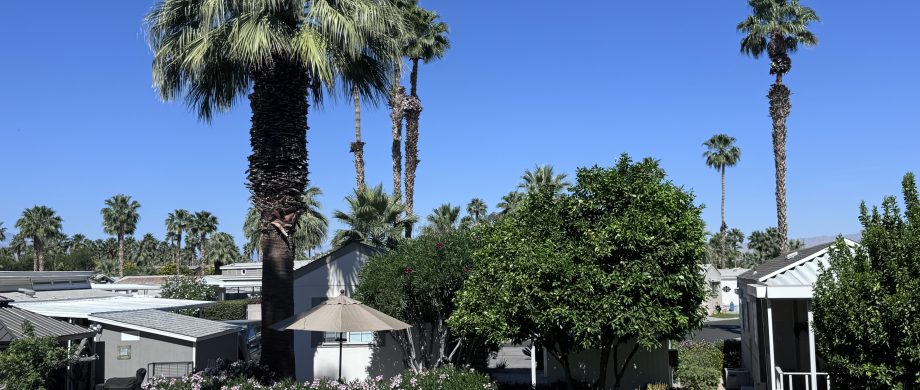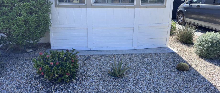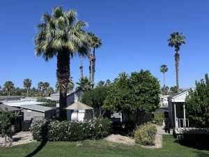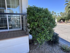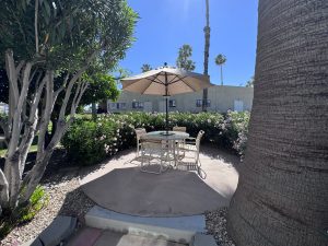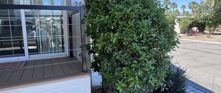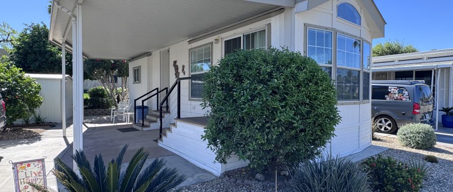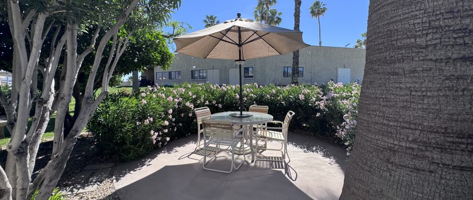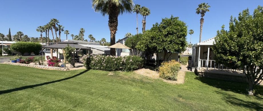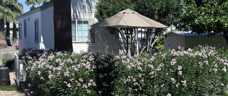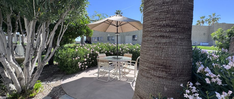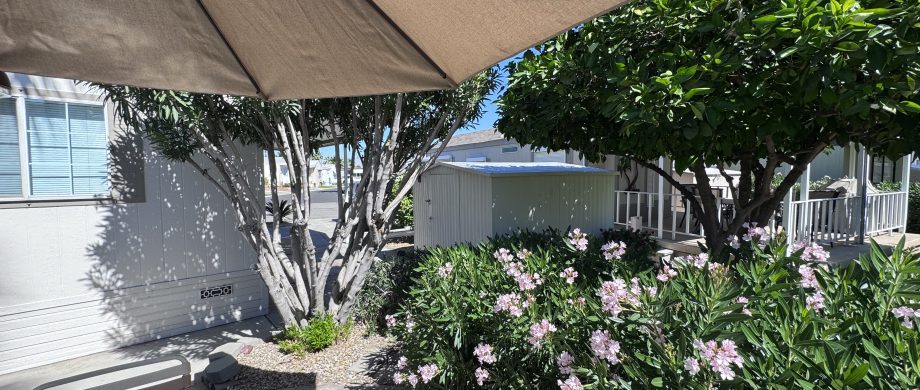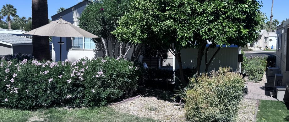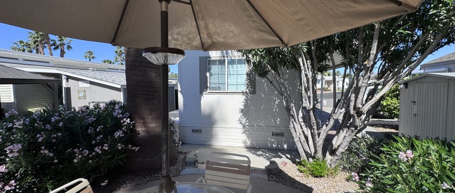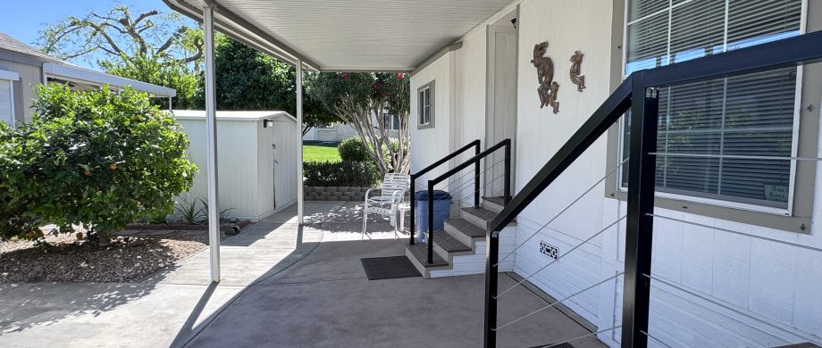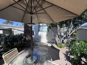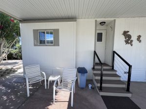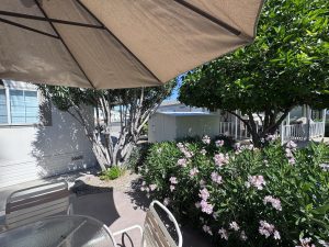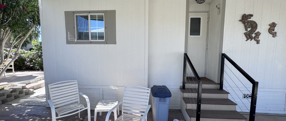 The large covered patio provides shade throughout the day and a separate patio with table, chairs and umbrella, that offers privacy with a nice hedge surrounding the perimeter and offers views of the mountains and one of the many ponds located through out the park. Both entry ways into the park model have been redone with composite deck material and a modern railing.