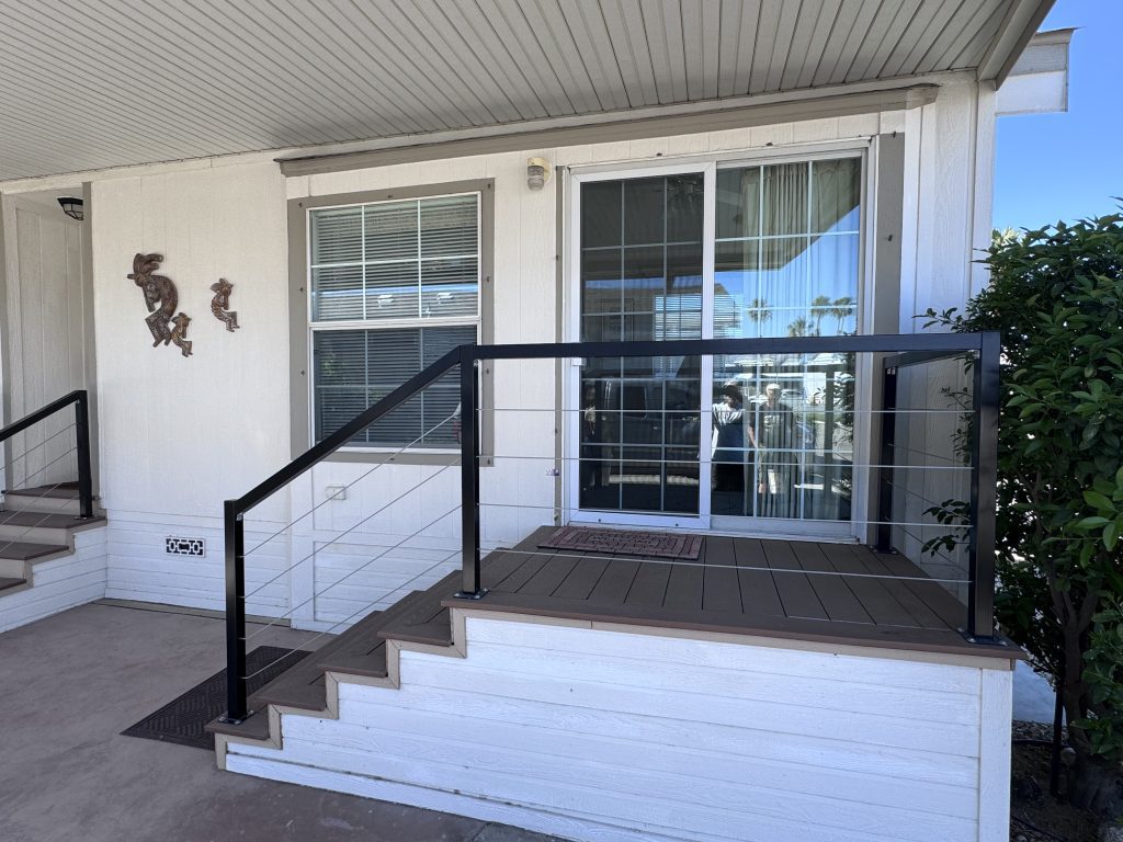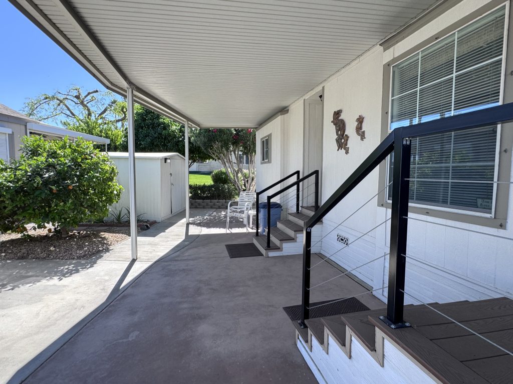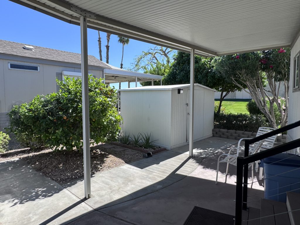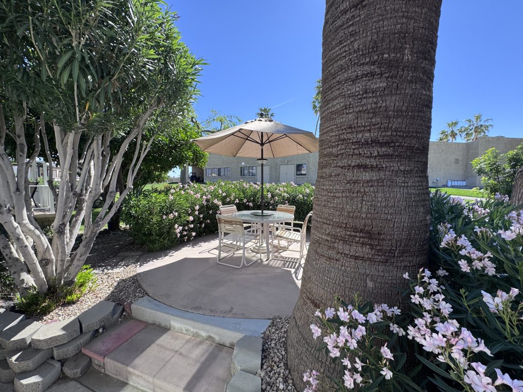 The large covered patio provides shade throughout the day and a separate patio with table, chairs and umbrella, that offers privacy with a nice hedge surrounding the perimeter and offers views of the mountains and one of the many ponds located through out the park. Both entry ways into the park model have been redone with composite deck material and a modern railing.
