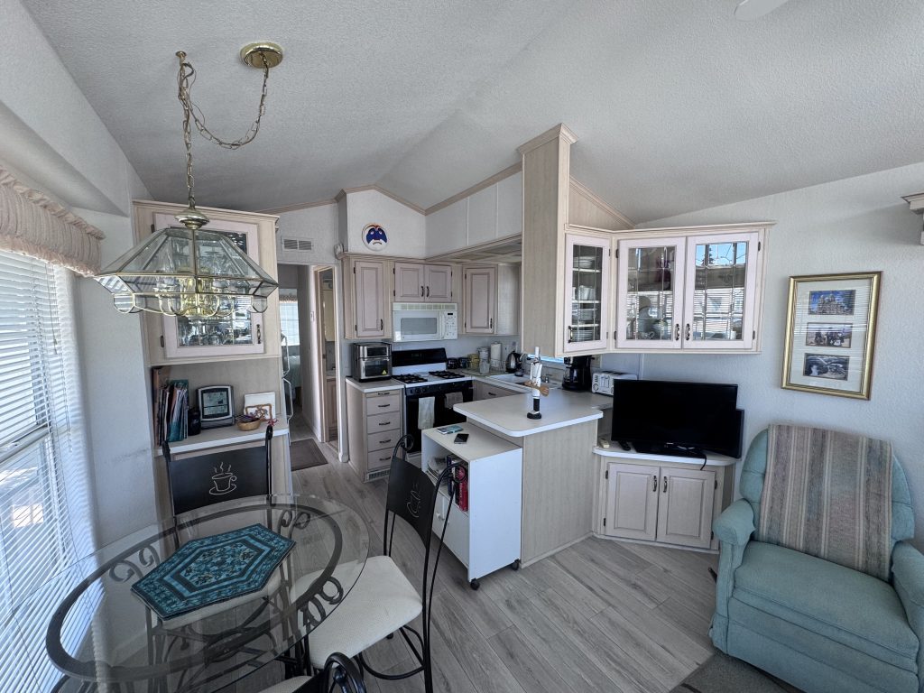 The interior of the park model is light and airy with high ceilings and lots of windows to let the light inside. All the cabinets throughout the park model have a light finish and adds to the openness this park model provides. The living room is open and offers plenty of seating.