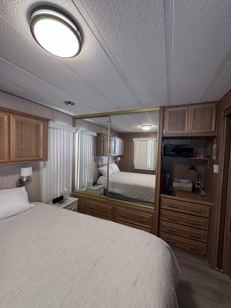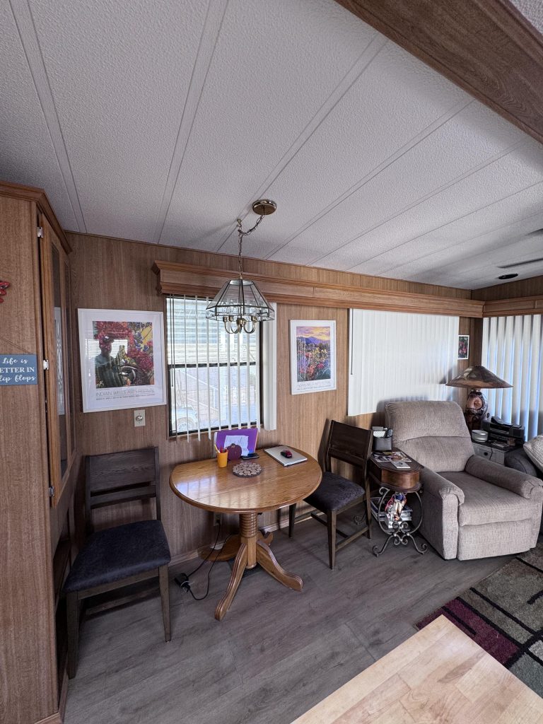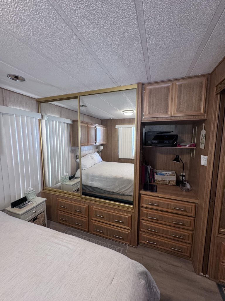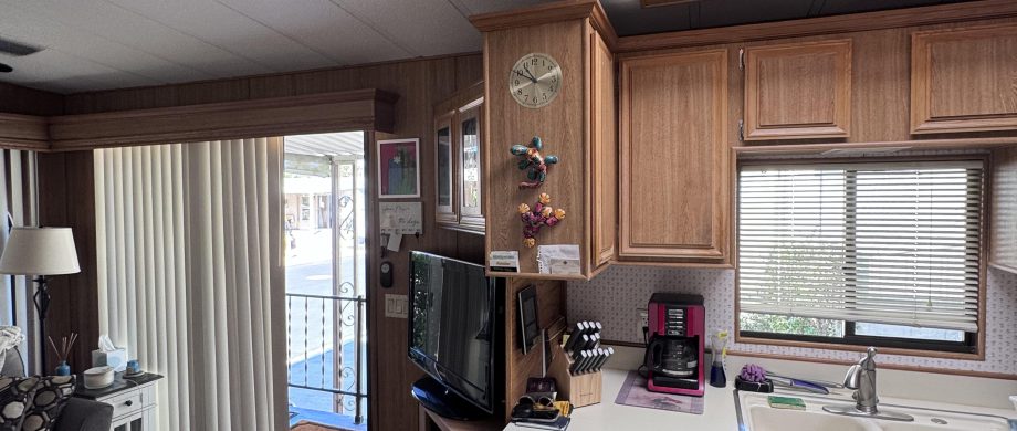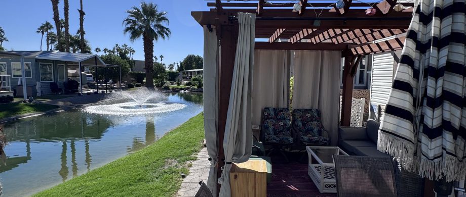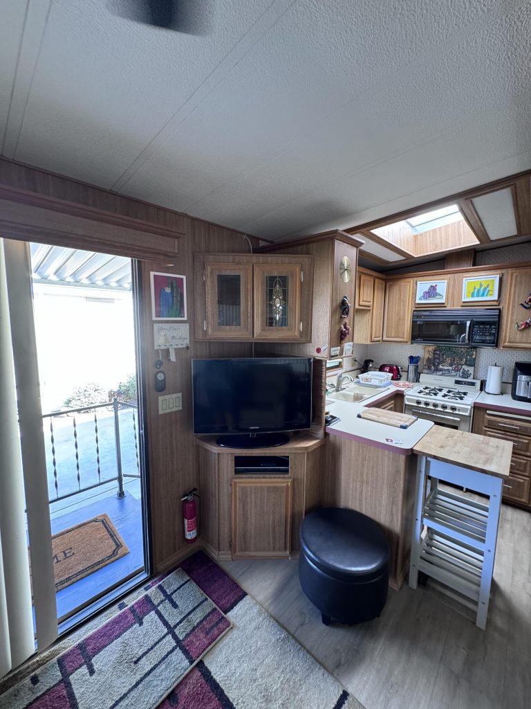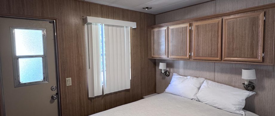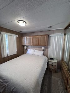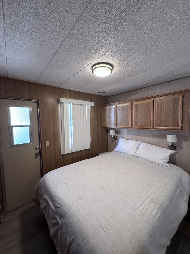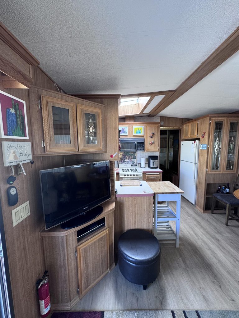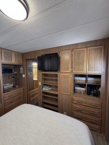If you are looking for a park model with lots of character and fantastic location, then this one is for you!! This park model is located on the water and offers great water views from the back patio and the beautiful pergola and seating arrangement.  Inside you will find the wood paneling is warm and inviting.  This park model comes fully furnished with everything you need to use as a rental property or for your own use.  The love seat converts into a bed if you need an extra sleeping space for those grand kids that will want to visit.  There is lots of storage space in the bedroom and hallway.