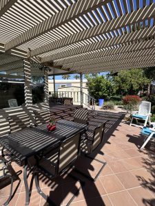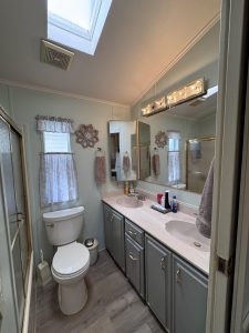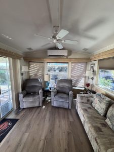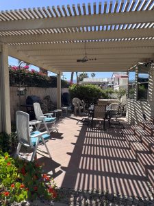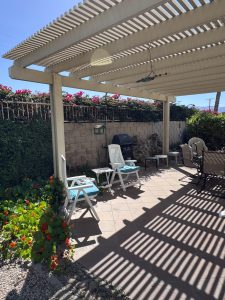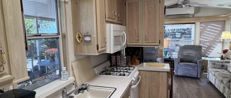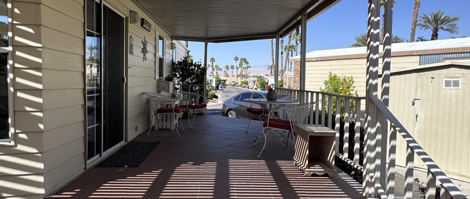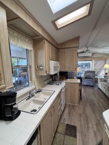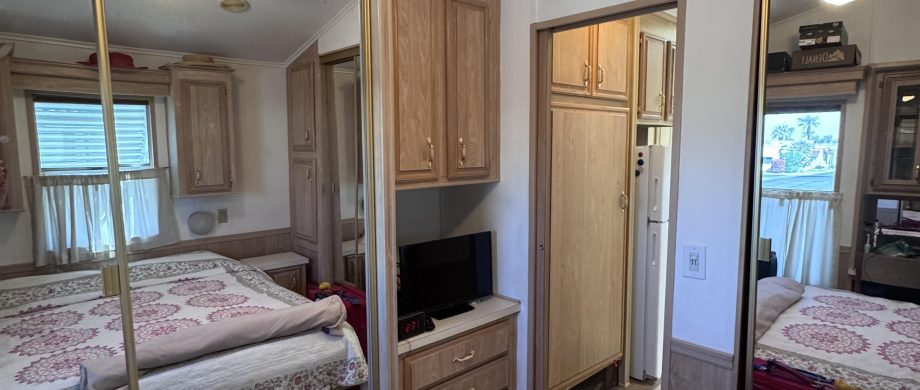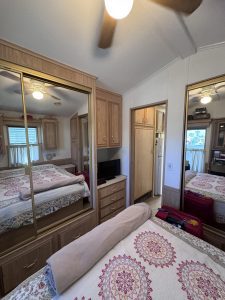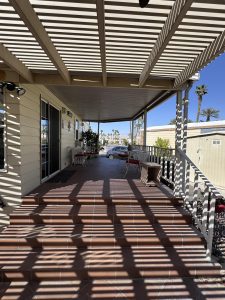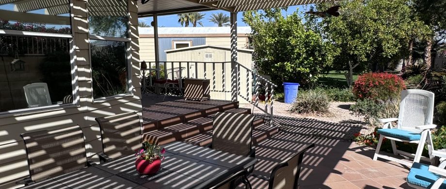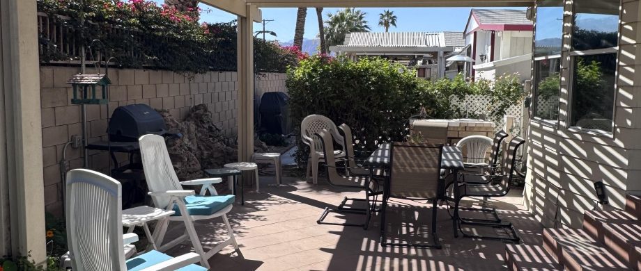 This 1991 park model is located on the south wall just steps from one of the bathrooms / laundry / pool areas. There is a large covered patio area in the back of the property complete with beautiful low maintenance landscaping, fruit trees, rock waterfall, patio furniture and BBQ. The storage features a washing machine, The current owners utilize the laundry facility across the street to dry their clothes. This park model shows pride of ownership and has been tastefully decorated. Some of the features include, new roof, new HVAC, new refrigerator, dishwasher, large pantry, laminate flooring, ceiling fans, sky lights, large bathroom with double sinks in the vanity. All of the furniture, bedding, kitchen & bath ware and patio furniture is included in the sale.
