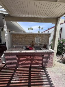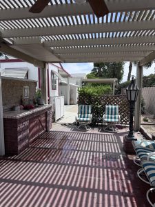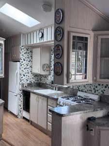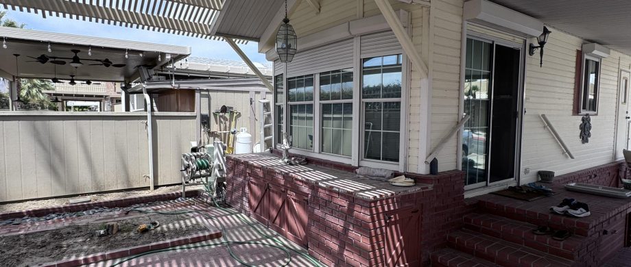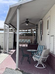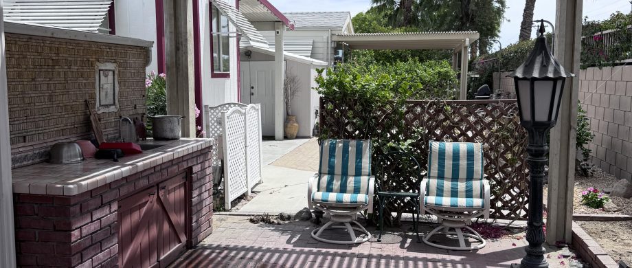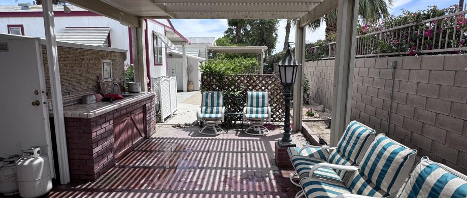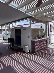 The outside features lots of upgrades with a large storage shed, and huge covered patios. The patios provide lots of privacy and have two large entertaining areas complete with wet bar. You will enjoy entertaining this great space. There is custom red brick skirting around the entire park model.