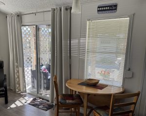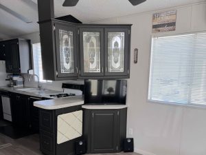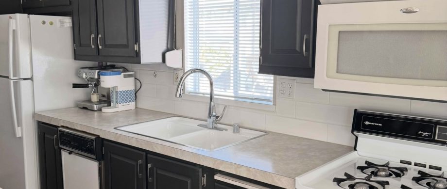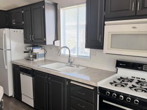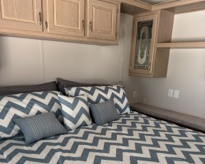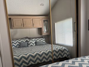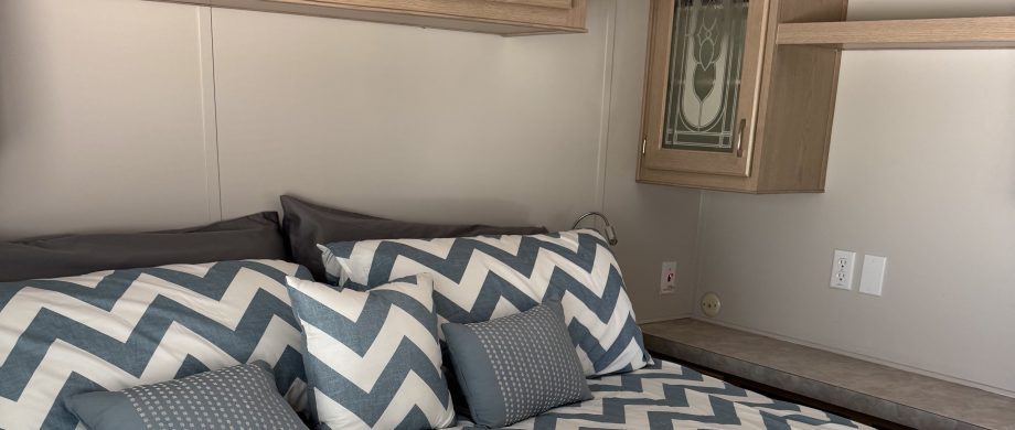 Bright interior boasts high ceilings, lamanite flooring and refinished updated cabinetry and new heat pump/air conditioner (2024). Other features include bedroom with kingsize bed (2024) with under bed storage, his and her mirrored closets as well as cabinets and drawers.