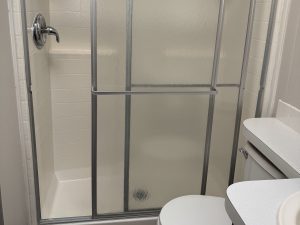 Bathroom has walk-in shower, sink with vanity, large linen closet, linoleum flooring and mirrored medicine chest.