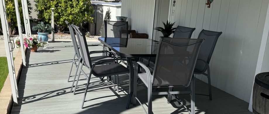 Large corner lot with 5 beautiful palm trees. Expansive mountain views and amazing sunsets can be enjoyed from the full length covered deck which includes new patio furniture including dining table with 6 chairs (2024), roller patio shades and fire table. Pool and laundry room are steps away.